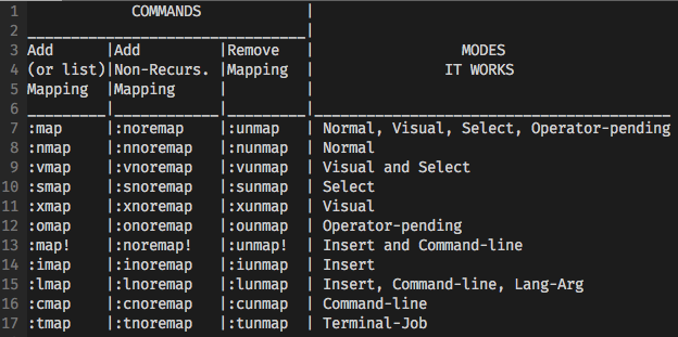 - Vim has commands for almost every key so, when creating mappings you must make good choices. Avoid changing the behavior of vim’s most important keys/commands. Get the best orientation at